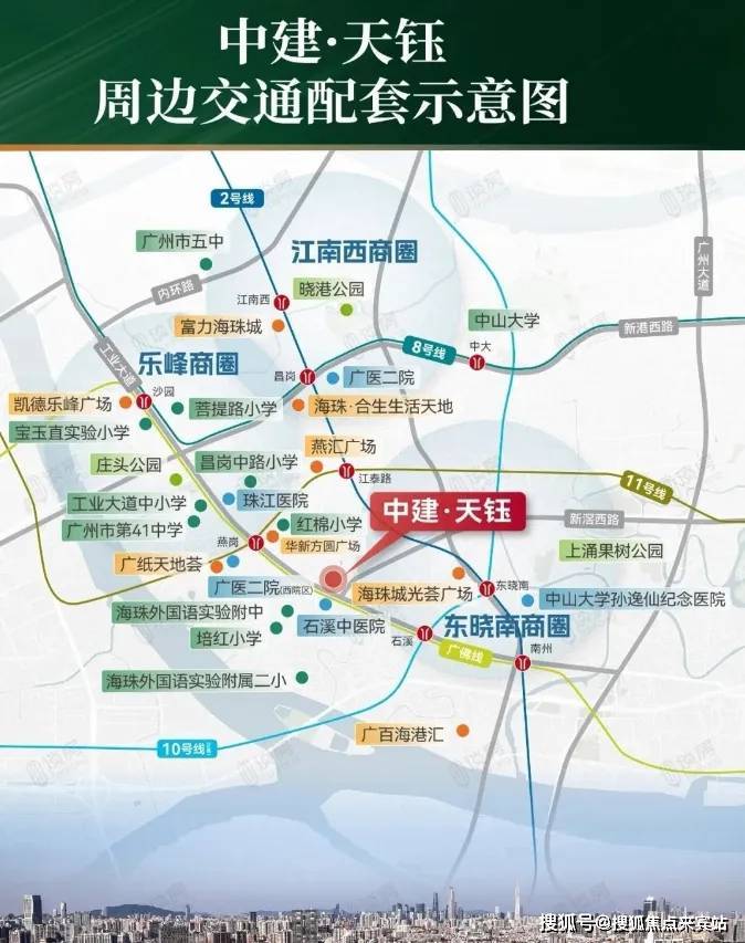 中建天钰位于海珠区核心地段,周边轨道交通资源丰富。项目位于广佛线燕岗站与石溪站之间,步行至燕岗站约750米,至石溪站约900米。燕岗站是广佛线与大环线11号线的换乘站,可快速通达琶洲、天河、越秀等核心区域。石溪站未来将成为广佛线和10号线的换乘站,可直达珠江新城,实现东西南北方向的通达。