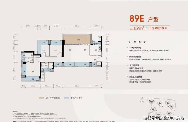 以89㎡户型来看,灵活可变的设计,轻松实现房间与客厅空间多变。