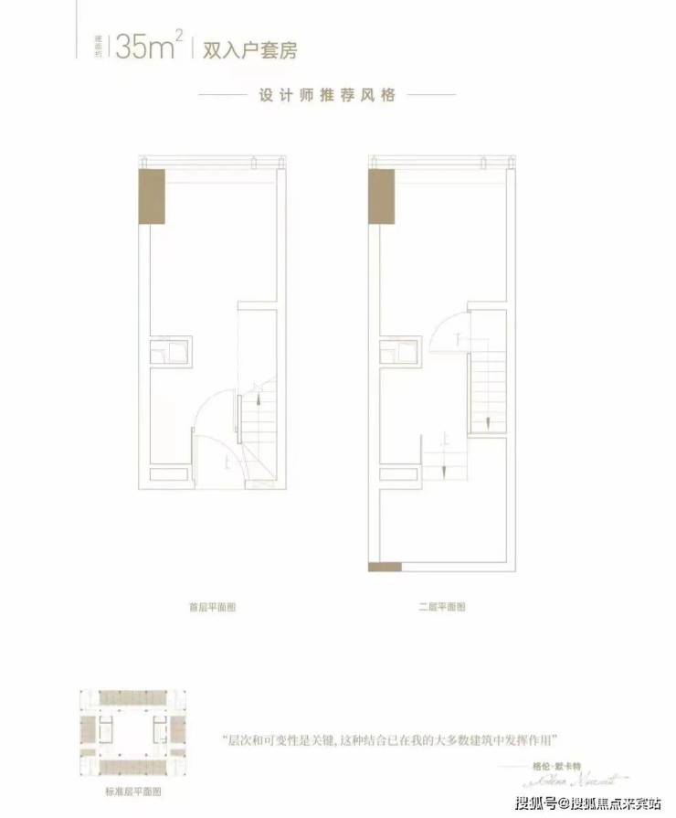 这些公寓位于高层21-34F,主要以35㎡复式双钥匙户型为主,同时还有少量的49㎡和65㎡大面积户型。