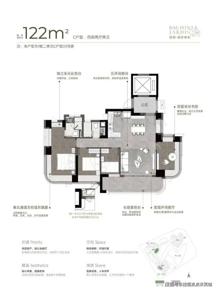 湾啟紫荆位于前海妈湾听海大道,占地约1.5万㎡,住宅建面约6.6万㎡,容积率5.14,共有三栋住宅组成,层高36-37F,共485户,车位595个,车位比1.1.2,4梯5户,主推约96㎡稀缺三房、111㎡3+1房、122㎡四房、142㎡四房。户型设计了大客厅、宽景阳台、阔景飘窗等,拥有山海河多重景观资源,计划品质精装交付。户型采用建筑新规设计,户户大阳台,4梯5户,分布式电梯设计,独立电梯厅。
