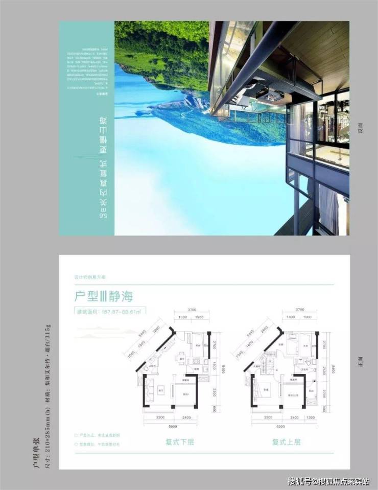 68平米2房,朝南,打开大门可以做到南北通透,客厅开间3米,5.6米的层高,复式两层,这个户型的上 下采光井,和一楼厨房外的阳台部分,如果搭板的话,可以做到4房,不搭的话,是个小两房。