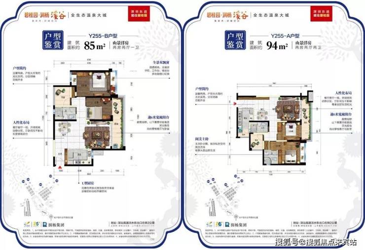 约 85㎡ 温泉洋房:2-3 房 2 卫,南北通透,户户引入天然温泉水,部分户型享山景/湖景;