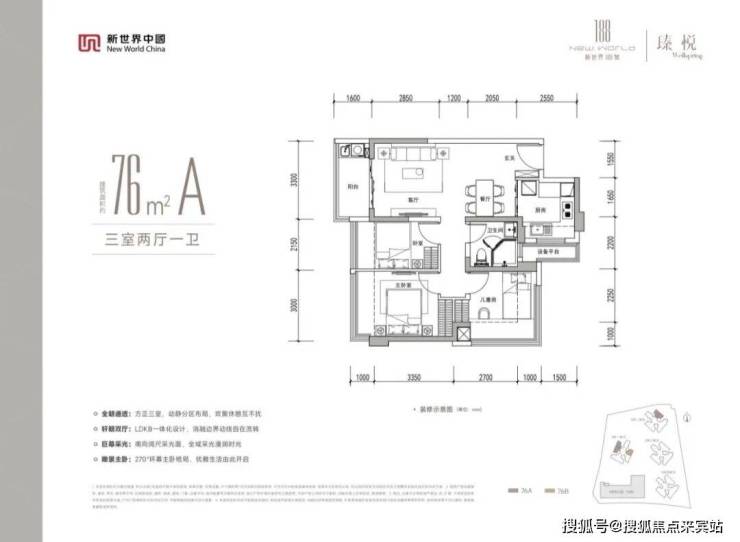76㎡的3房2厅1卫,设计的是竖厅格局,客厅3.3米开间,LDKB一体化设计,动静分区,分别做到了主卧12.3㎡/次卧11.02㎡/次卧8.28㎡(包含墙体飘窗),U型厨房,卫生间干湿分离,同时带1个设备阳台约1.5㎡,阳台约5.28㎡东北、西北或东南朝向。