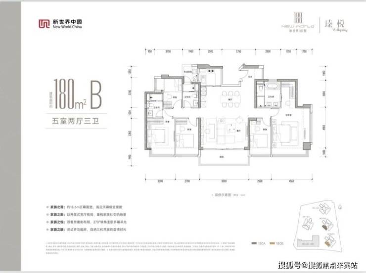 180㎡的5房2厅3卫,设计的是竖厅双龙抱珠格局,客厅5.5米开间,LDKB一体化设计,五开间朝南,约18.6米巨幕面宽,双主卧套间,分别做到了主卧30.5㎡/次卧15.45㎡/次卧11.75㎡/次卧10.87㎡/次卧8.5㎡(包含墙体飘窗),U型厨房,公卫带1个生活阳台约3.89平,阳台约10.73㎡西南朝向。