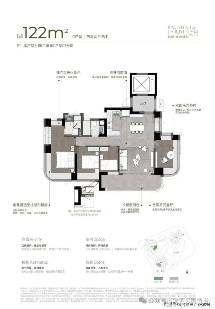 双龙抱珠户型,书房分布于客厅另一侧,且难得是双面采光+270°景观视野。主卧南北通透,且拥有十分开阔的景观面。贯通式阳台联通客厅以及靠近动区的次卧,实现长观景阳台