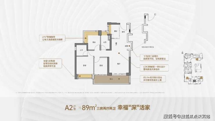 89㎡3房A2户型:正西向、正东向、正南向均有分布,竖厅格局,客厅3.5米开间,LDKB一体化,动静分区,次卧270度转角飘窗,主卧12.54㎡,客厅连接次卧出5.9米长的大阳台,卫生间干湿分离。
