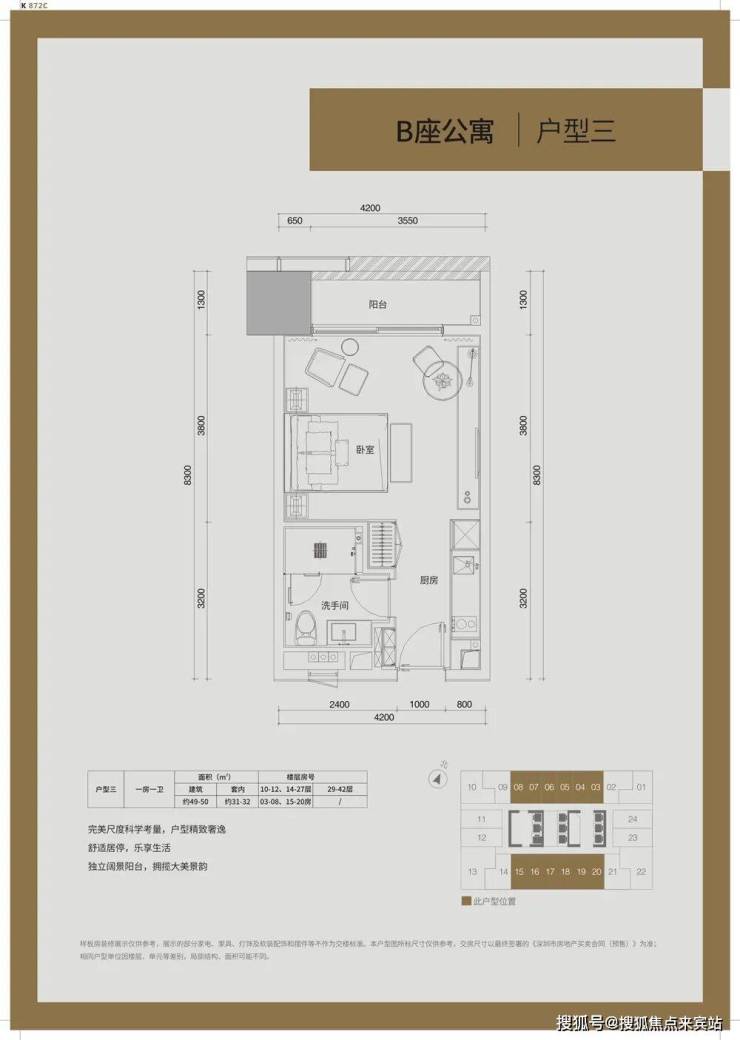 单房户型开间达4.2米,采光优秀户型方正,1.5米宽大阳台具有较高的实用性能。室内空间划分结构紧凑,起居空间宽敞舒适。