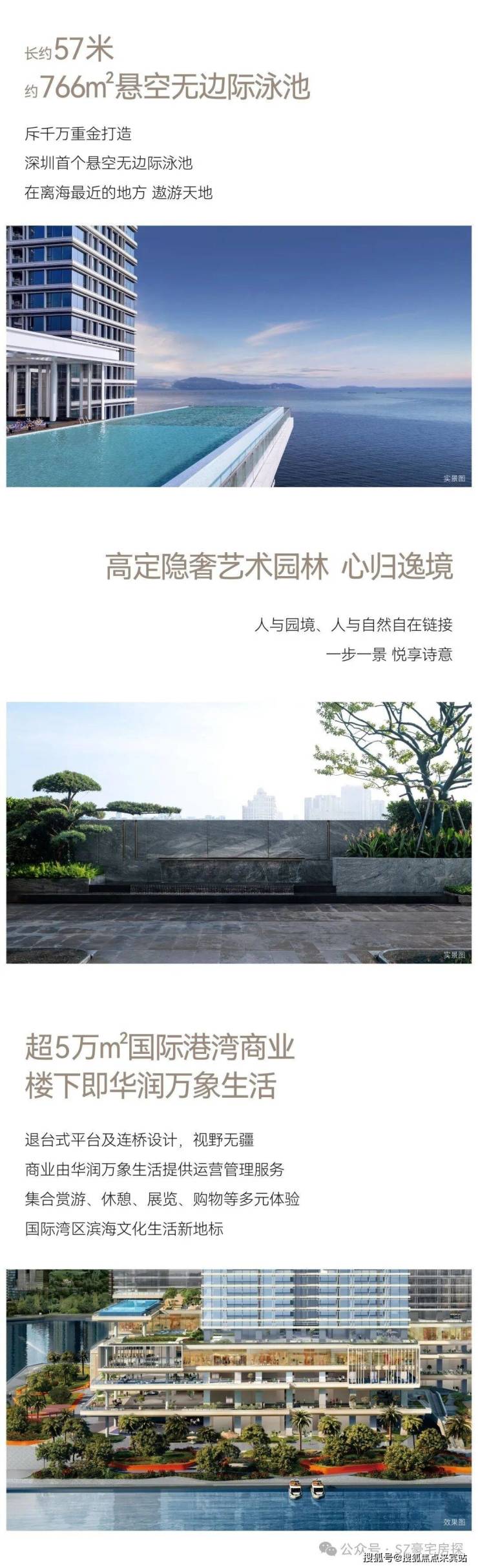 内部配套:配备高端私密会所、约 766 平方米的深圳首个悬空无边际海景泳池、首层城市花园、健身房、儿童游乐区以及 1800 平方米的海洋博物馆等设施。