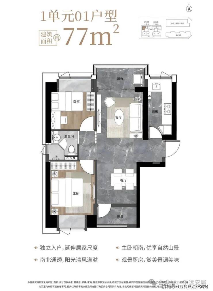 77㎡的2房2厅1卫,1栋1单元01户型,设计的是竖厅南北通透格局,独立入户,客餐厅分离设计,动静分区,南北双阳台,L型厨房,卫生间干湿分离,客厅阳台正北朝向。