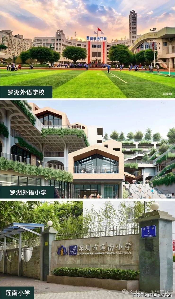 自带 1 所公办 9 班制幼儿园,楼下还在建 36 班九年一贯制学校。学区方面,小学划入第 24 大学区,涵盖莲南小学、罗湖外语小学等 7 所学校;初中学区对应罗湖外语初中学校,该校在罗湖区均分排名前三。