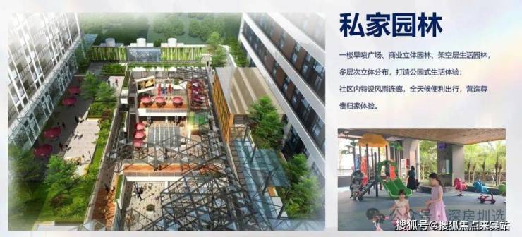 项目的第4层为架空园林,项目园林设计结合了科技、自然、现代时尚的元素,为住户打造一个都市公园。规划有儿童活动区、露台活动区、架空层活动区、环形跑道等,将景观和时尚融为一体;