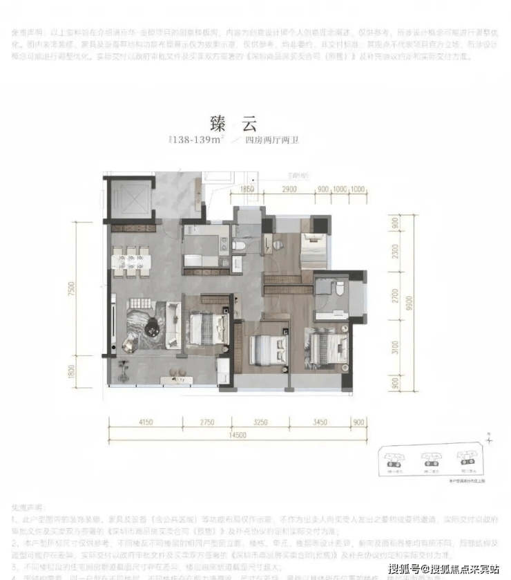 138㎡的4房2厅2卫,设计的是经典竖厅格局,独立专梯入户,客厅4.15米开间,LDKB一体化设计,四开间朝南,分别做到了主卧19.31㎡/次卧13㎡/次卧12.16㎡/次卧8.8㎡(包含墙体飘窗),客厅连接次卧出6.9米长的观景大阳台,U型厨房,公卫三段式分离,得房率78.2%(不含赠送),西南朝向。