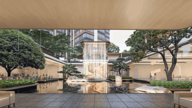 加之挺拔的灿金门头、大气的斜飘罗汉松、寓意高升的典雅台阶,再以水景点缀,尊崇感铺面而来
