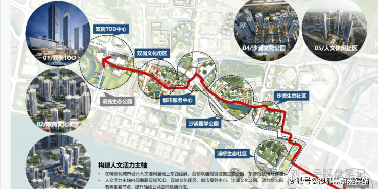 西至设施生态公园,东联南海神庙,构建串联TOD商业、文化街区、都市服务、生态社区等重点项目的漫游活力轴,重点塑造“双岗TOD中心、都市服务中心”两大综合商业地标及“双岗、沙涌”两大休闲文化街区