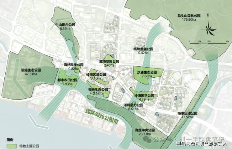 中建海丝城板块内规划22个城市公园,6大城市生态公园+9大特色主题公园+7个口袋休闲公园,背靠5000亩龙头山森林公园,南望珠江,5000亩龙头山森林公园(直线1公里)、东侧海事运动公园(直线150米)、西北侧沙浦国学公园(直线400米)、沙浦生态公园(直线600米),打造环绕式立体生态系统,百年沙浦,古榕树下,风水塘边,感受城市脉络与烟火温度,实现“推窗见绿,出门入园”。