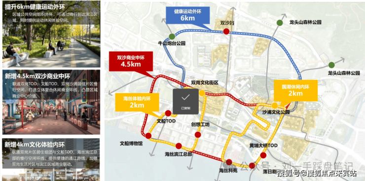 构建“两轴、一带、三廊、三环”的慢行系统网络,三环分别为6公里运动外环连接滨江,4.5公里商业中环连接华润万象系TOD商业,4公里文化体验内环连接各重要空间