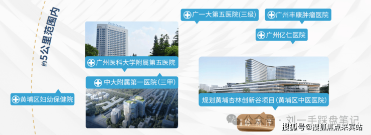 家门口的国家级三甲医疗配套 全时健康守护,多家三甲医院环绕:黄埔区中医医院(三甲,建设中),距离项目约500米(百度地图直线实测),打造黄埔区首个国家级中医药领域示范高地;中大附属第一医院东院区(三甲);广州医科大学附属第五医院(三甲)等