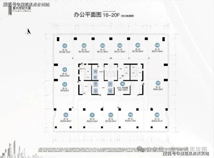 办公产品:建面61㎡-2300㎡,可自由组合,楼层15-20层,层高4米,办公环境宽敞明亮,6梯15户,高效便捷