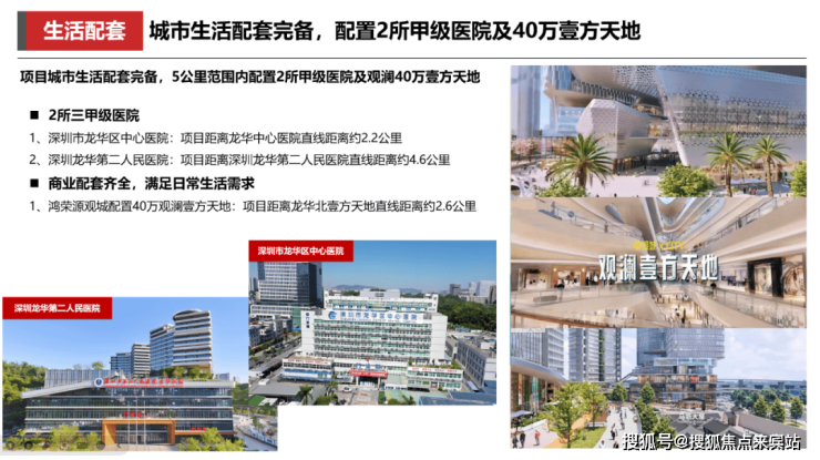项目配建有社区底商,约5公里范围内现有福城天虹购物中心,其内商业品牌众多,在未来还有鸿荣源观城壹方近40万㎡的集中商业,也会是整个观澜的商业标杆,其中包含“壹方天地2.0”(约20万㎡集中商业),对标前海壹方城,规划引入国际一线品牌、特色餐饮及智慧购物体验。