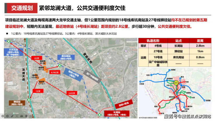 项目区域内主次干路体系完善,交通便捷。片区交通规划优异,规划打造“4线2路”的交通体系,1公里范围内拥享18号线库坑南站及27号线狮径站,临近梅观高速及龙澜大道两大龙华交通主轴,30分钟可达深圳北站及福田CBD核心区,不过当前最近的4号线“长湖站”距离约2.8公里,步行超30分钟以上。