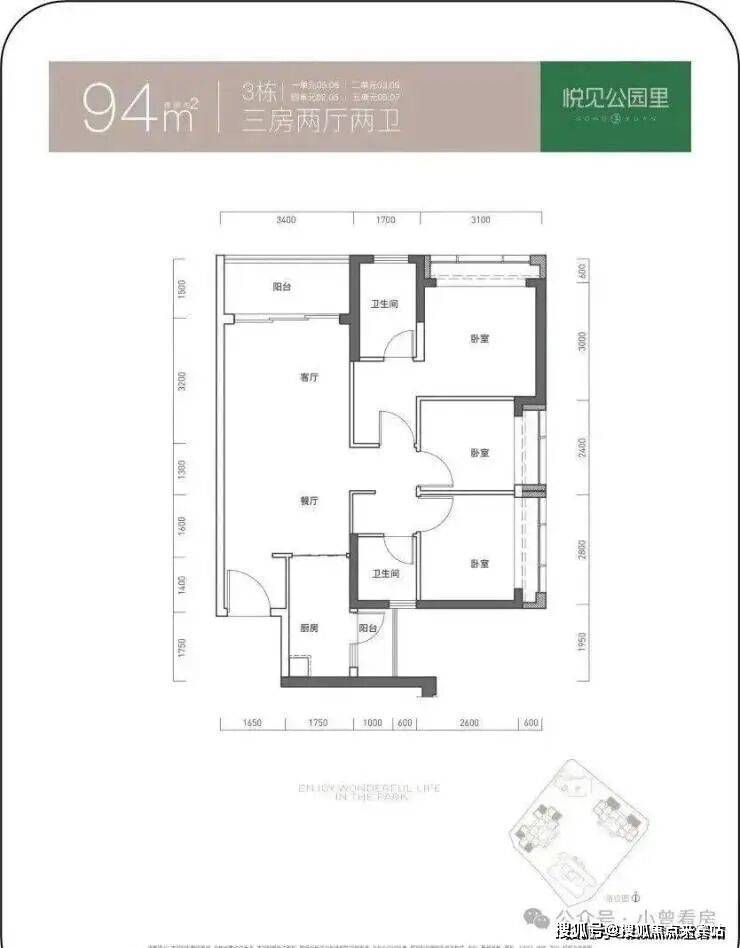94㎡的3房2厅2卫,设计的是竖厅格局,客厅3.4米开间,LDKB一体化设计,3个卧室分别做到了3.1米/2.8米/2.4米的宽度,L型厨房带1个生活阳台,公卫三段式分离,得房率73.71%(不含赠送),有西北、东北或西南朝向。