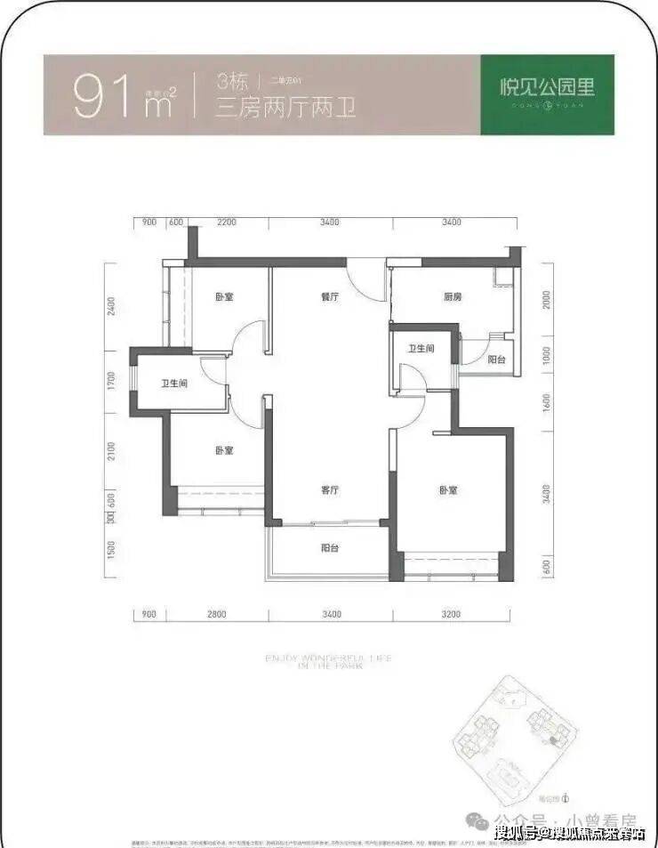 91㎡的3房2厅2卫,仅3栋2单元01户型,设计的是竖厅双龙抱珠格局,客厅3.4米开间,三开间朝南,3个卧室分别做到了3.2米/2.8米/2.4米的宽度,L型厨房带1个生活阳台,卫生间干湿分离,得房率73.55%(不含赠送),西南朝向。