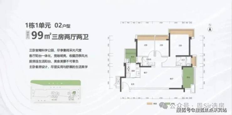 99㎡的3房2厅2卫,1栋1单元02户型,设计的是竖厅格局,客厅3.5米开间,LDKB一体化设计,进深11.7米,动静分区,三卧室朝东北向看科学公园,3个卧室分别做到了主卧18.06㎡/次卧9.57㎡/次卧7.59㎡(包含飘窗),二字型厨房还带1个生活阳台,公卫三段式分离,得房率约:80%(不含赠送),阳台6.55㎡东南朝向。套内面积79.2㎡+赠送面积12.58㎡=实用面积91.78㎡,加上赠送后得房率约92.7%。