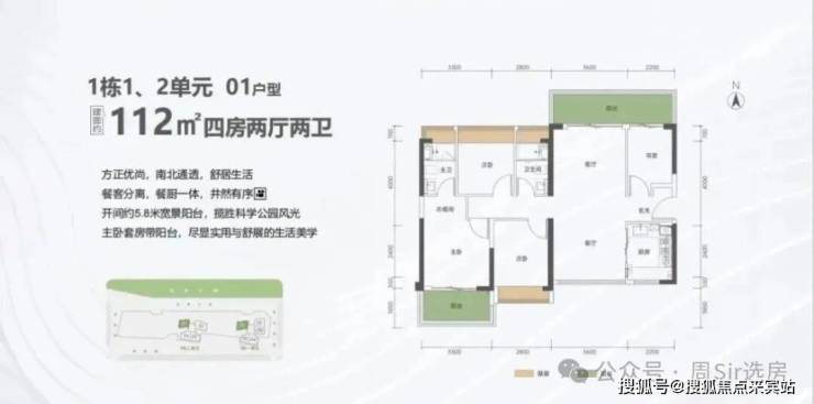112㎡的4房2厅2卫,1栋1/2单元01户型,设计的是竖厅南北通透格局,进门入户玄关,客厅3.6米开间,餐客分离,餐厨一体设计,四开间朝南,主卧套房带阳台,4个卧室分别做到了主卧18.43㎡/次卧10.5㎡/次卧9.12㎡/次卧7.26㎡(包含墙体飘窗),客厅连接次卧出9.28㎡的巨幕大阳台,U型厨房,卫生间干湿分离,得房率约:80%(不含赠送),阳台主朝东北向看科学公园。套内面积89.6㎡+赠送面积16.1㎡=实用面积105.7㎡,加上赠送后得房率约94.37%。