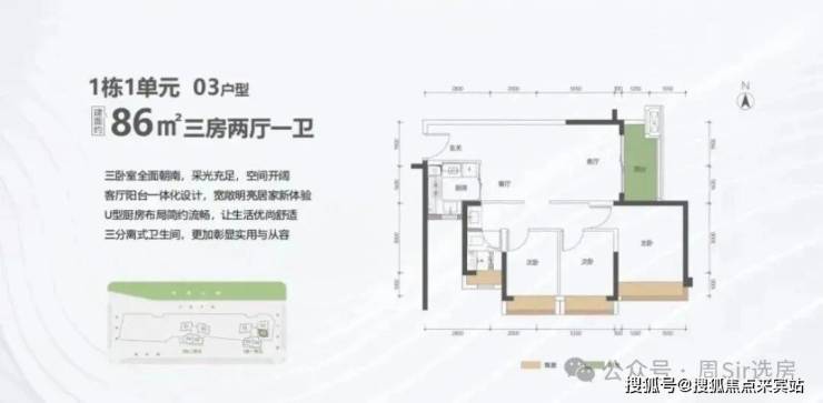 86㎡的3房2厅1卫,1栋1单元03户型,设计的是竖厅格局,客厅3.5米开间,LDKB一体化设计,进深10.05米,主卧全朝南,动静分区,3个卧室分别做到了主卧11.67㎡/次卧8.64㎡/次卧8.46㎡(包含飘窗),U型厨房,卫生间三段式分离,得房率约:80%(不含赠送),阳台5.5㎡东南朝向。套内面积68.8㎡+赠送面积8.5㎡=实用面积77.3㎡,加上赠送后得房率约89.88%。
