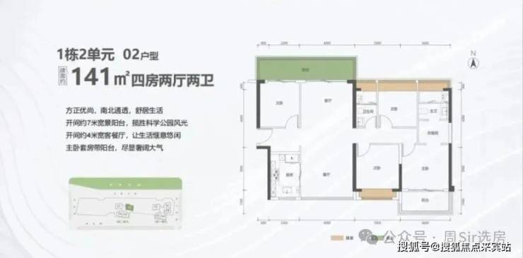 141㎡的4房2厅2卫,1栋2单元02户型,设计的是竖厅南北通透格局,进门入户玄关,客厅4米开间,餐客分离,餐厨一体设计,四开间朝南,主卧套房带阳台,4个卧室分别做到了主卧21.96㎡/次卧13.2㎡/次卧10.2㎡/次卧9.86㎡(包含墙体飘窗),客厅连接次卧出11.55㎡的巨幕大阳台,U型厨房,卫生间干湿分离,得房率约:80%(不含赠送),阳台主朝东北向看科学公园。套内面积112.8㎡+赠送面积18.5㎡=实用面积131.3㎡,加上赠送后得房率约93.12%。