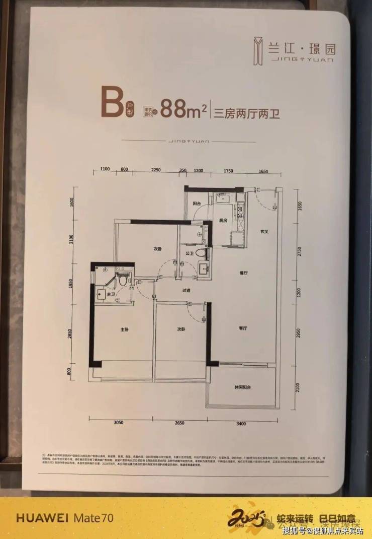 88m²的3房2厅2卫,设计的经典竖厅格局,进门入户玄关,客厅3.4米开间,LDKB一体化设计,三开间朝南,动静分区,分别做到了主卧10.98m²/次卧9.3m²/次卧6.49m²(实测面积,去掉墙体),L型厨房带1个小生活阳台1.92m²,卫生间干湿分离,得房率78.8%(不含赠送),客厅阳台7.14平东南朝向,看小区园林或比亚迪+山景。套内面积68.73m²+飘窗6.24m²+阳台4.53m²=实际套内79.5m²,加上赠送面积后得房率约90.62%。