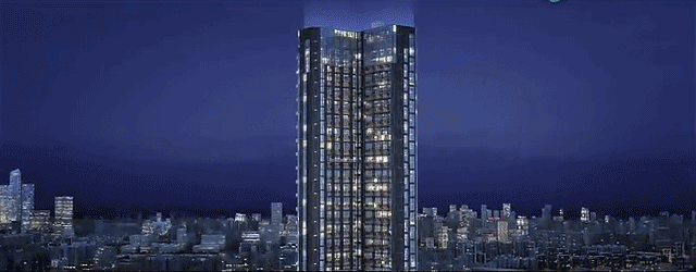整栋建筑高 150 米,呈现 L 型布局,外立面是全玻璃幕墙设计,最大程度地保证了每一户的通风、采光与景观面,更是将山海城的景观视野做到了完美演绎。