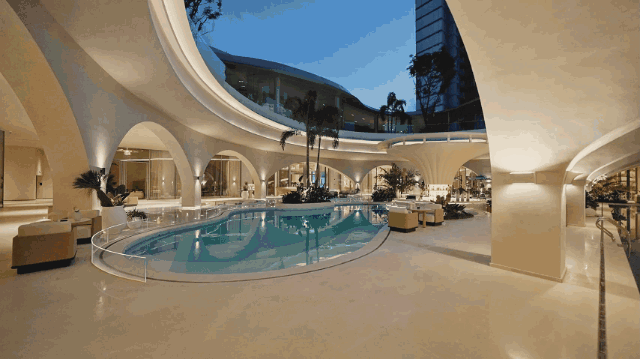 穿过花园连廊来到会所。这座会所是以高端度假酒店为标准打造,每一处细节都彰显着低调奢华的格调。泳池、健身房、会客厅等功能应有尽有。