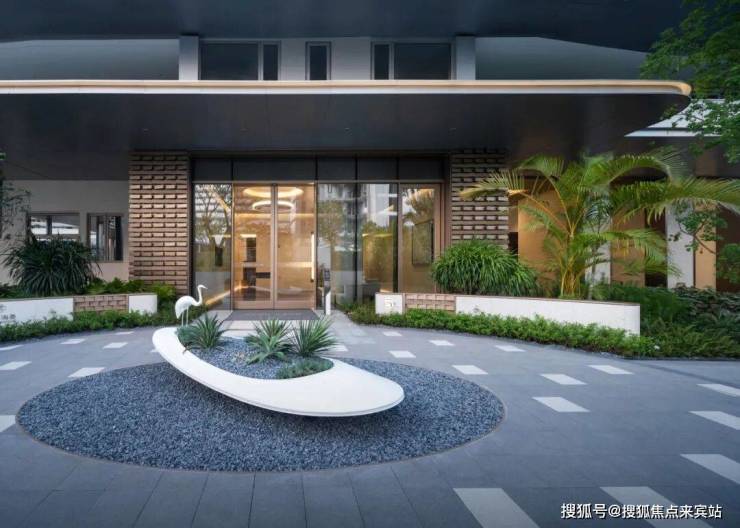 在社区大门的设计中,设计师运用了流畅舒展的曲线与富有节奏感的叠级结构,使建筑宛如起伏的海浪,既自由奔放又充满韵律。步入小区之前,人们便能感受到迎面而来的度假氛围,自然而然地沉浸于轻松惬意的空间体验之中。