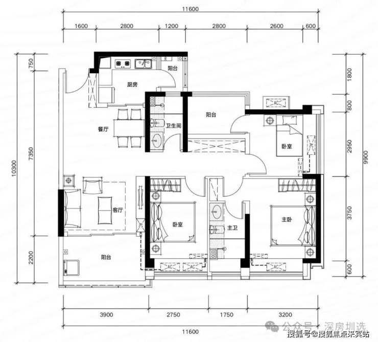 G02户型:约109㎡ 四房两厅两卫: