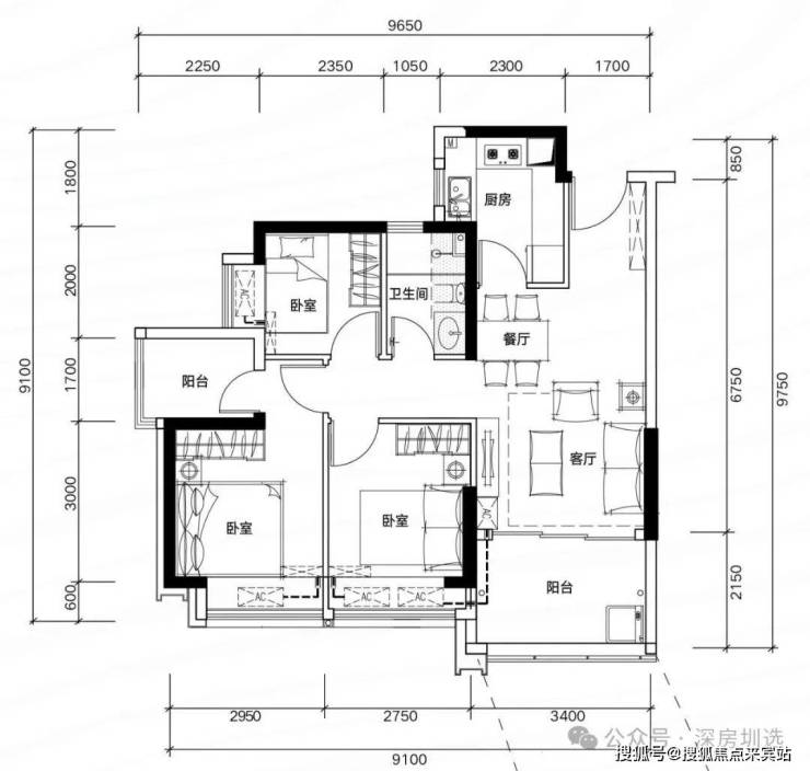 H01户型:约81㎡ 三房两厅两卫: