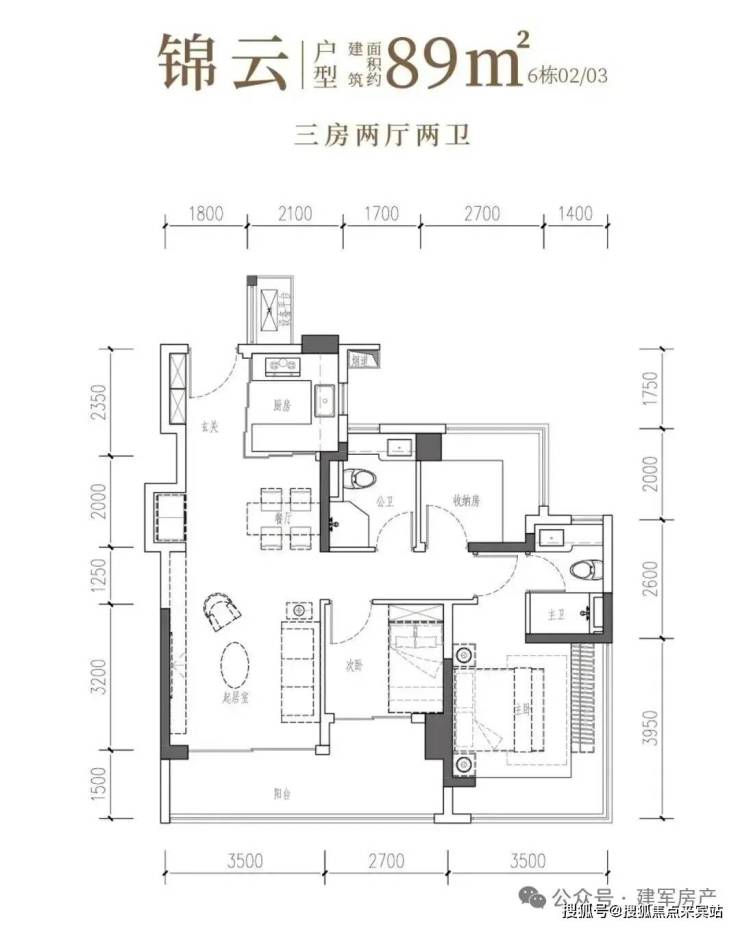 89㎡的3房2厅2卫,6栋02/03户型,设计的是经典竖厅格局,客厅3.5米开间,LDKB一体化,S墙设计预留冰箱卡槽位,三开间朝南,动静分区,主卧+次卧270°无柱转角飘窗,分别做到了主卧15.25㎡/次卧7.56㎡/次卧6.48㎡(包含墙体飘窗),U型厨房烟道外置,卫生间干湿分离,得房率约97.47%(包含赠送),客厅连接次卧出大阳台约11.46平,西南或东南朝向。主要区别在于次卧跟主卫空间。