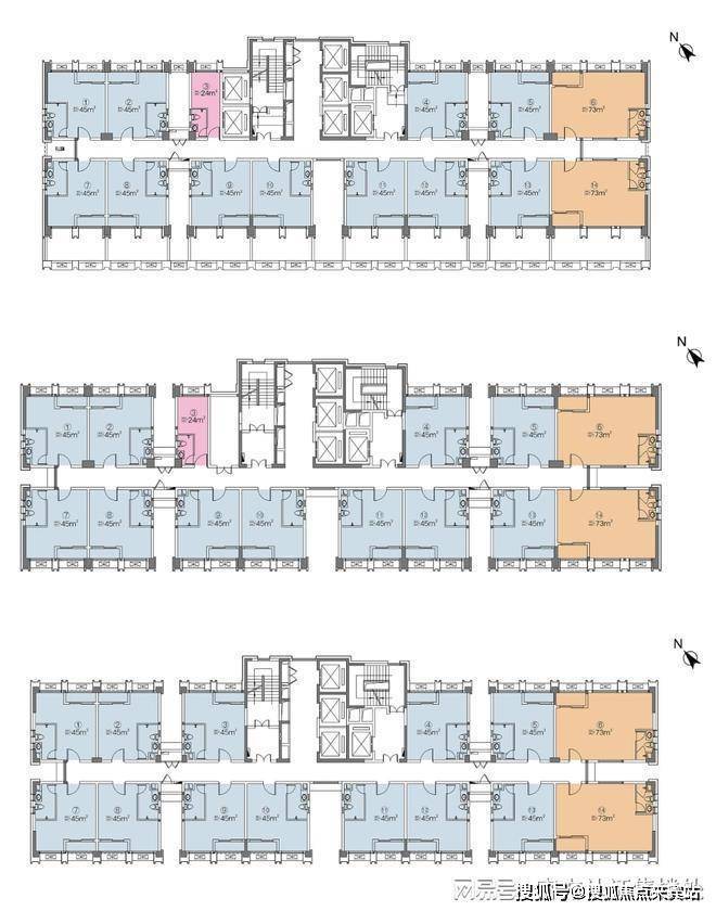 1B栋3T8户(约45㎡/64㎡/87㎡2~3房) 3栋4T12户(约45㎡2房)