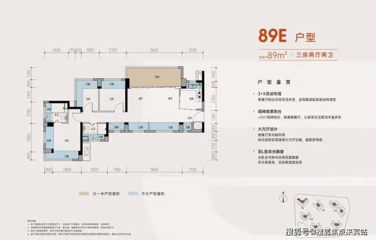 约87㎡横厅三房:约105%使用率,5.6m开间,最具性价比!折后总价约288-310万
