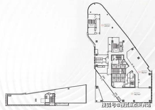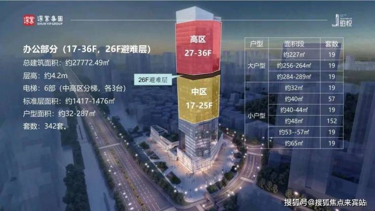 ① 办公:位于17-36层,整体面积约27767.36㎡,单层面积约1460㎡,标准层高4.2米