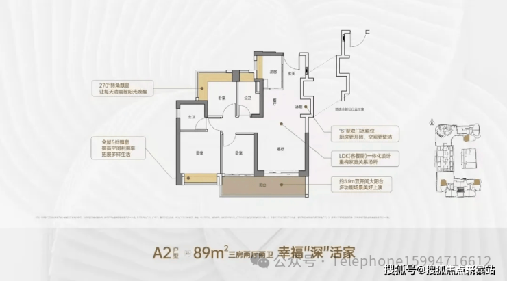 分布于1栋1/2/5单元,朝向多样,包括南向、东向和西向。竖厅格局,客厅3.5米开间,连接次卧出5.9米长大阳台。A1户型主卧双面飘窗,次卧270度转角飘窗;A2户型次卧270度转角飘窗,较A1少一面飘窗。U型厨房,卫生间干湿分离。