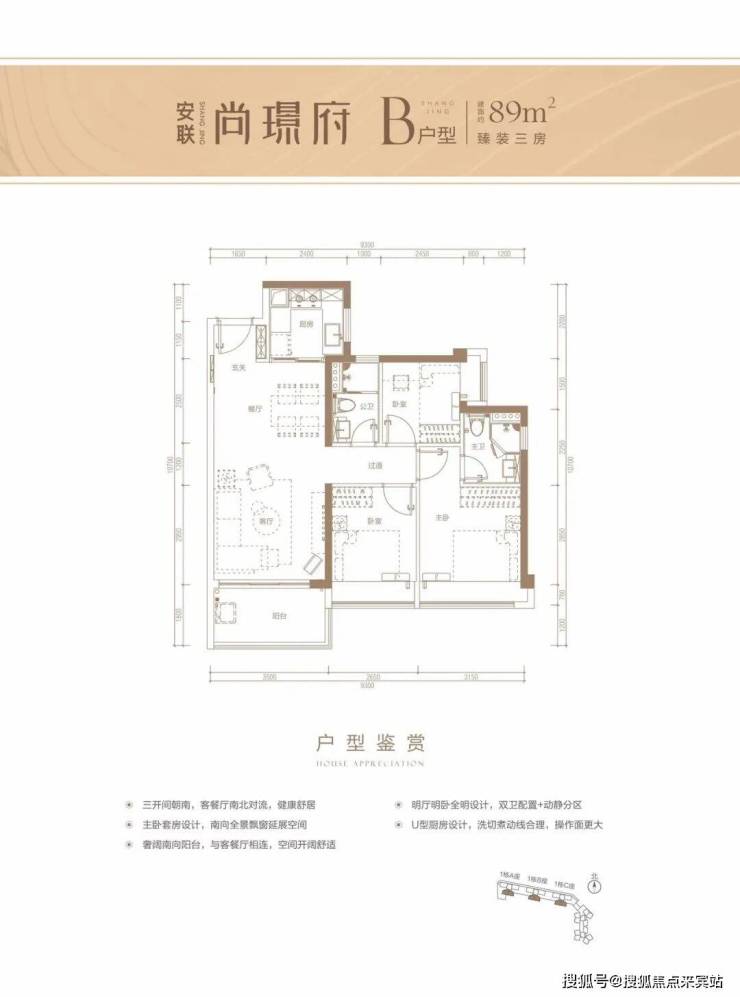 89㎡的3房2厅2卫,设计的是经典竖厅格局,客厅3.5米开间,LDKB一体化设计,三开间朝南,动静分区,分别做到了主卧12.68㎡/次卧9.41㎡/次卧7.02㎡(包含墙体飘窗),U型厨房,卫生间干湿分离,得房率约78.2%(不含赠送),阳台6.3m²正南朝向。套内面积69.82m²+赠送面积8.85m²=实用面积78.67m²,加上赠送后得房率约88.1%。