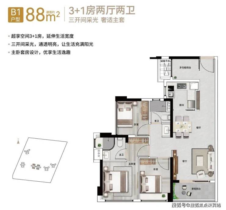 【88㎡3+1房2厅2卫】阔绰横厅格局,南北通透