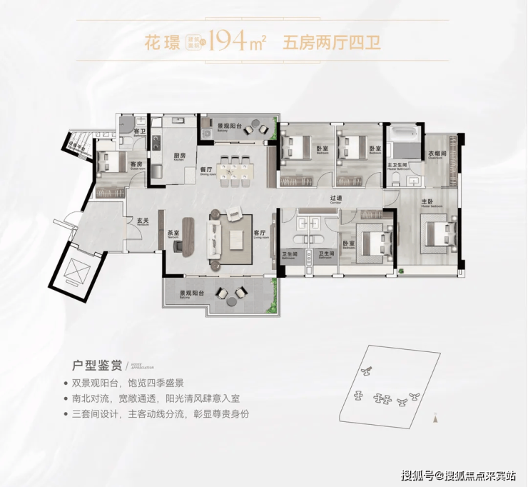 【194㎡五房2厅4卫(三套房)】南北对流双景观阳台,约32㎡奢华主套,配衣帽间