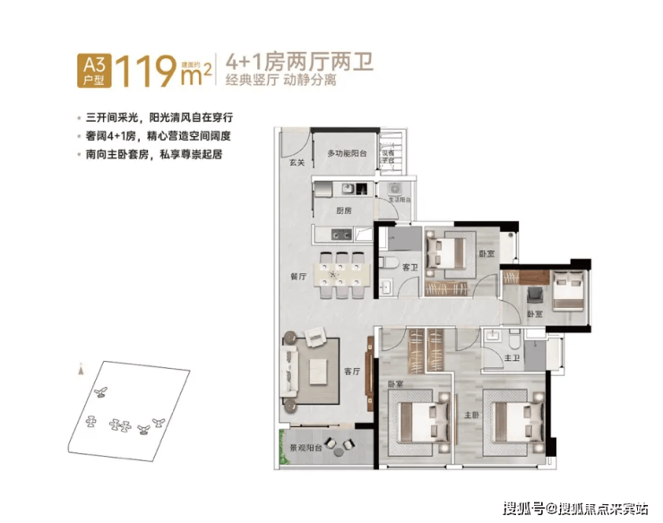 【119㎡4+1房2厅2卫】南向通风三开间采光,经典竖厅,南向奢阔主套,配步入式衣帽间