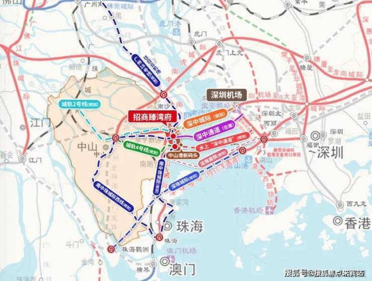 马鞍岛作为综合性的交通枢纽,向东连接深圳、向北连通广州,向南接连珠海、对内拉通中山中心区,汇聚多条重要的轨道交通、高快速道路。