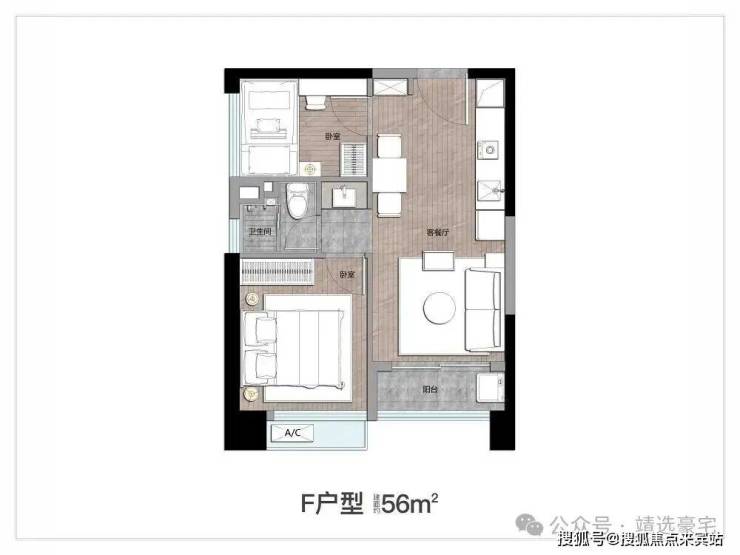 约56㎡产品:两房布局,全明空间,户型方正实用,餐厨客厅连贯一体,客厅接驳阳台;