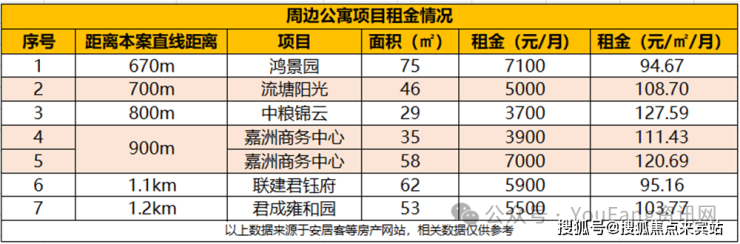 目前距离本项目约700m的45㎡产品的月租金可达5000元,同时周边73㎡产品的月租金可达7000元。