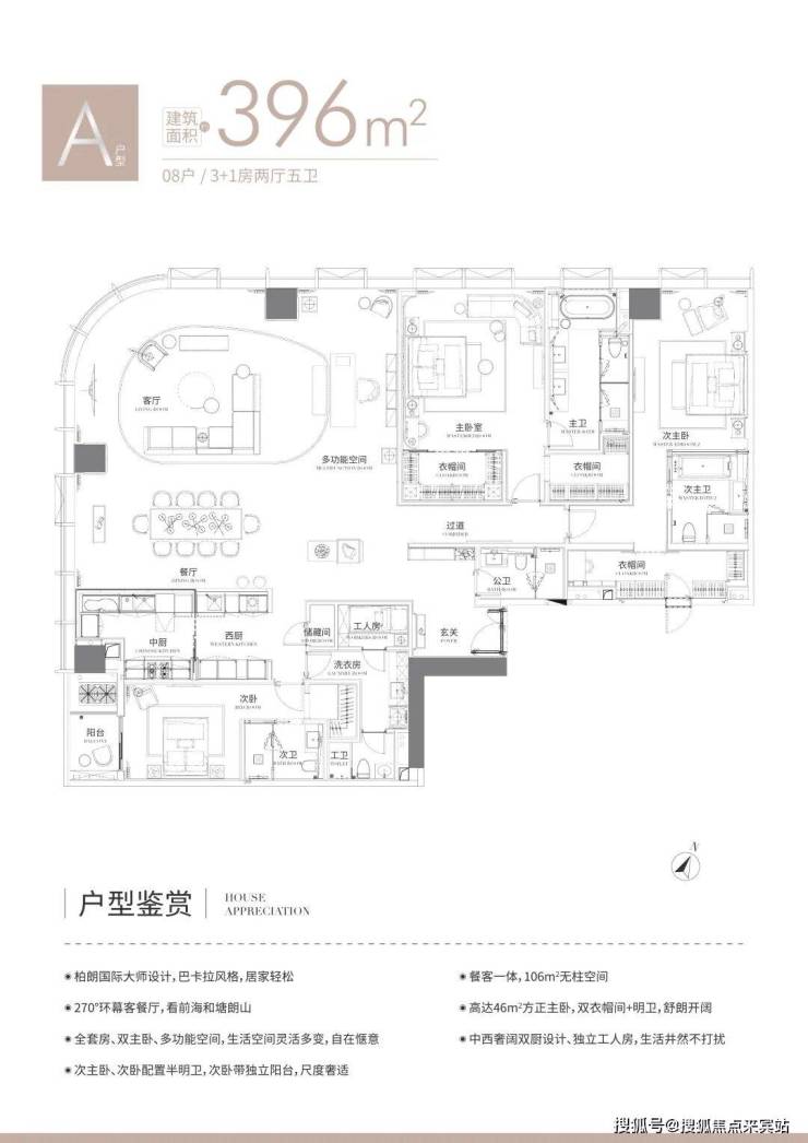 A户型:396㎡,3+1房2厅2厨5卫,西北向,全套房双主卧,次卧带阳台。