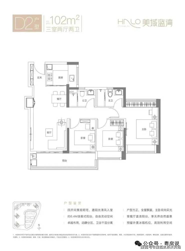 102㎡的3房2厅2卫,D4户型,经典竖厅格局,客厅3.7米开间,LDKB一体化设计,S墙设计预留冰箱卡槽位,U型厨房,卫生间干湿分离,三开间朝南,客厅连接次卧出6.4米长的观景大阳台约9.75m²,东南朝向看小区园林,得房率约75.3%(不含赠送),加上赠送得房率83.97%。